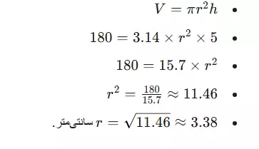 حجم یک استوانه 180 سانتیمتر مکعب و ارتفاع آن 5 سانتیمتر است. شعاع قاعده آن چقدر است؟ (π≈3.14)