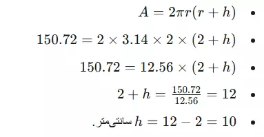 مساحت کل یک استوانه 150.72 سانتیمتر مربع و شعاع آن 2 سانتیمتر است. ارتفاع آن چقدر است؟ (π≈3.14)