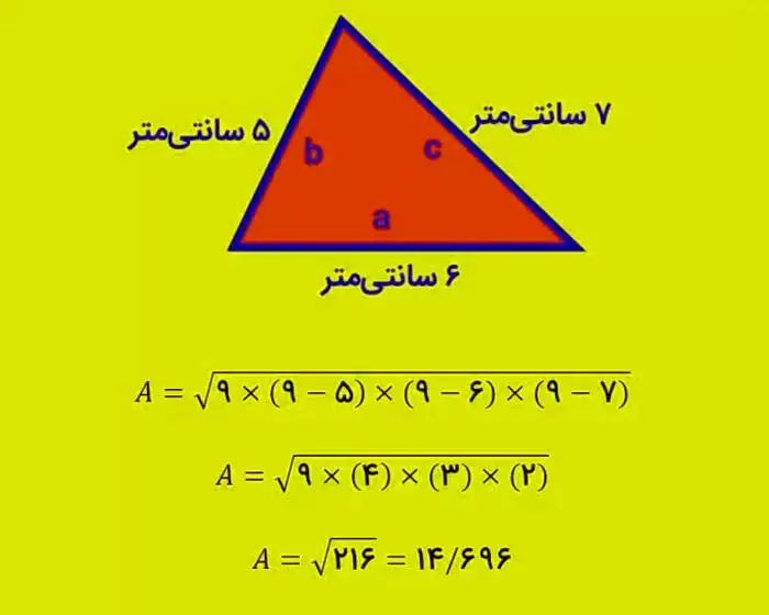 مساحت = √[s × (s - a) × (s - b) × (s - c)]