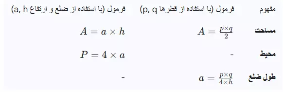 آموزش مساحت لوزی 0 تا 100 و فرمول محیط+ PDF و 12 مثال